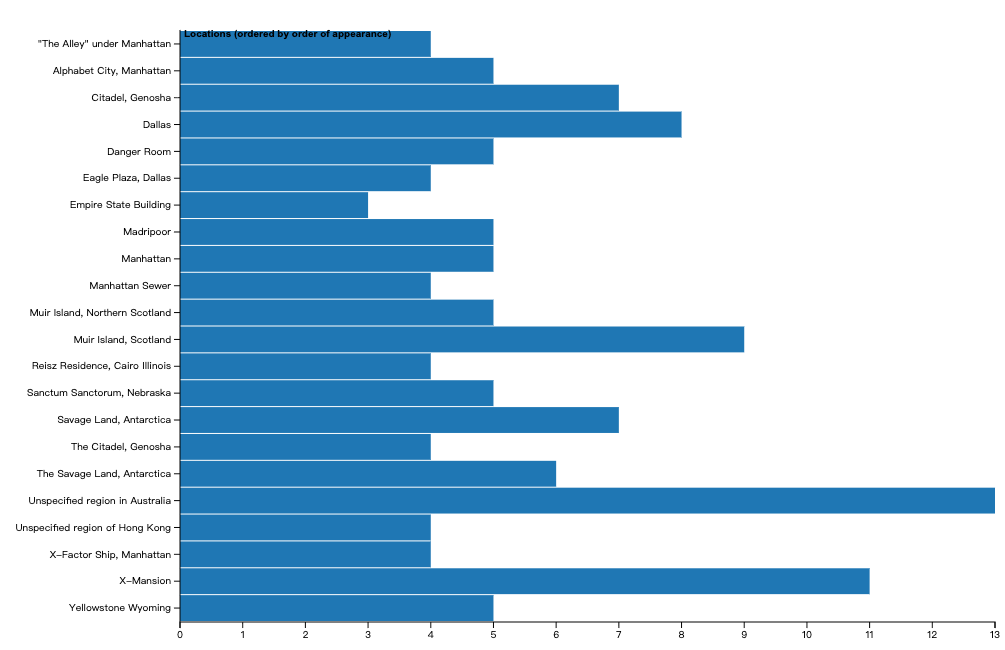 Perhaps the most interesting data point comes from analyzing the locations where these narratives unfold. Traditionally, the X-Men are anchored to their Mansion in New York. However, the location frequency data for issues 220-280 tells a story of total displacement.